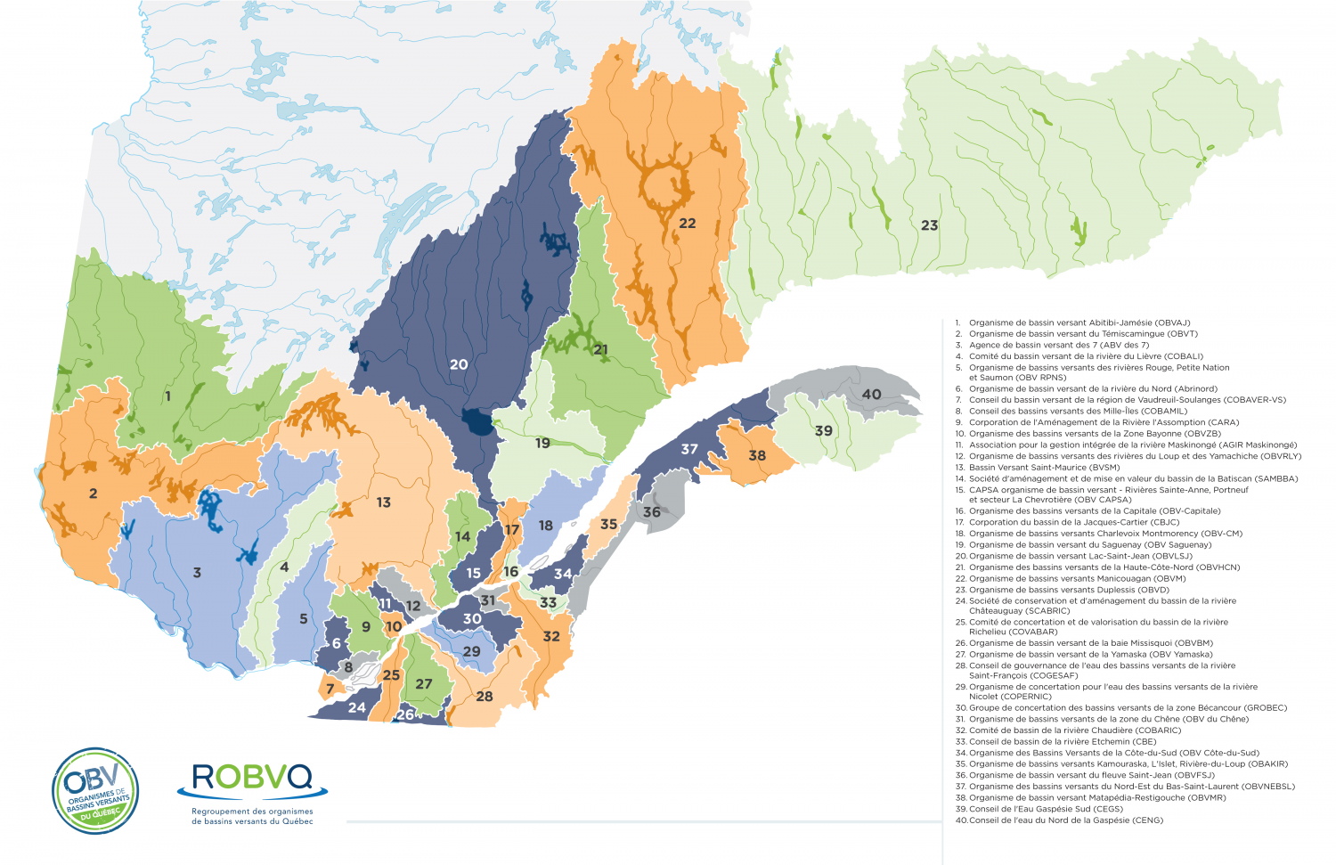Les 40 organismes de bassins versants (OBV) reconnus et légalement constitués planifient des actions ciblées et représentatives de leur milieu afin de protéger et de valoriser le réseau hydrographique de leur territoire. Ils sont présents sur l’ensemble du territoire québécois méridional.